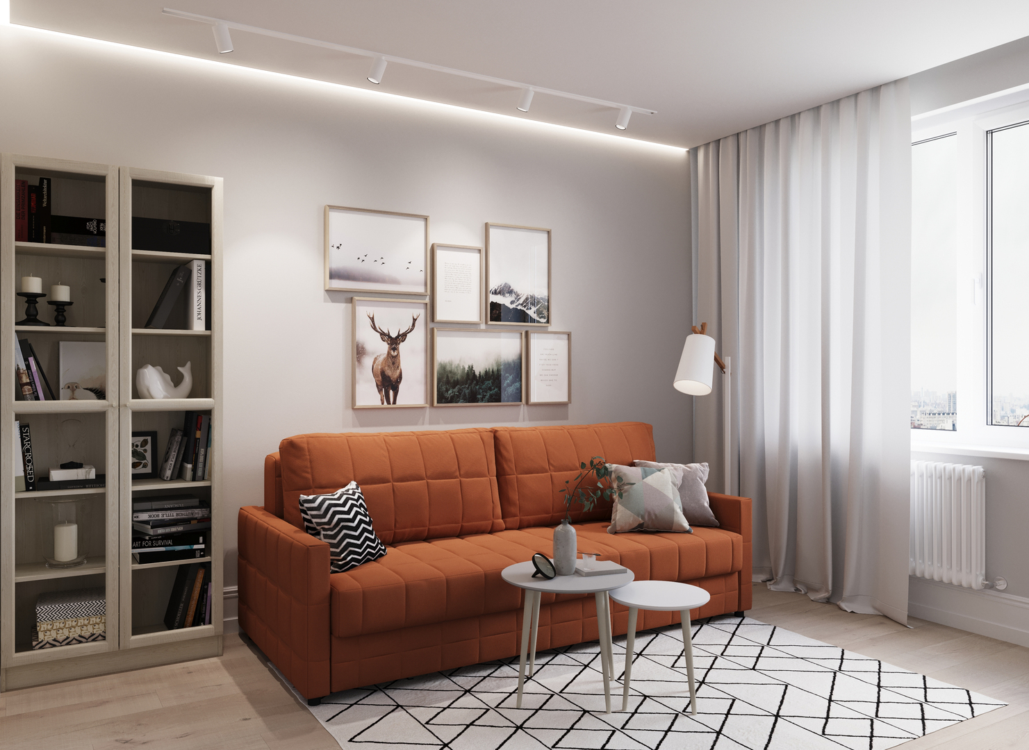 Синка, выполненная в обивочной ткани, позволяет ставить диван в центре комнаты и зонировать пространство.