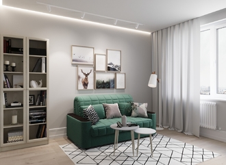 Спинка, выполненная в обивочной ткани, позволяет ставить диван в центре комнаты и зонировать пространство.