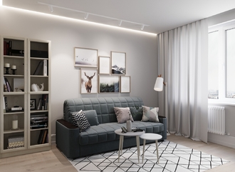 Спинка, выполненная в обивочной ткани, позволяет ставить диван в центре комнаты и зонировать пространство.