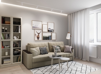 Спинка, выполненная в обивочной ткани, позволяет ставить диван в центре комнаты и зонировать пространство.