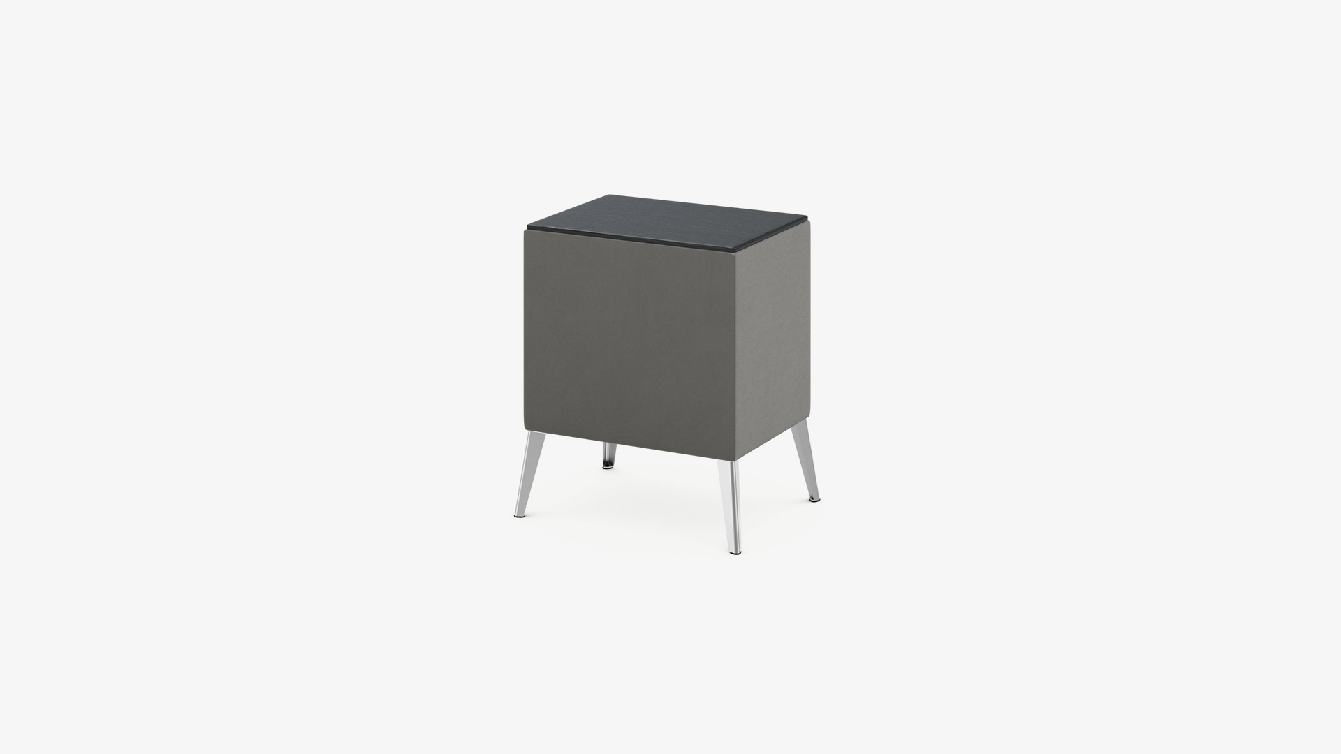 Обратная сторона тумбы, выполненная в обивочной ткани, позволяет ставить ее в центре комнаты и зонировать пространство.