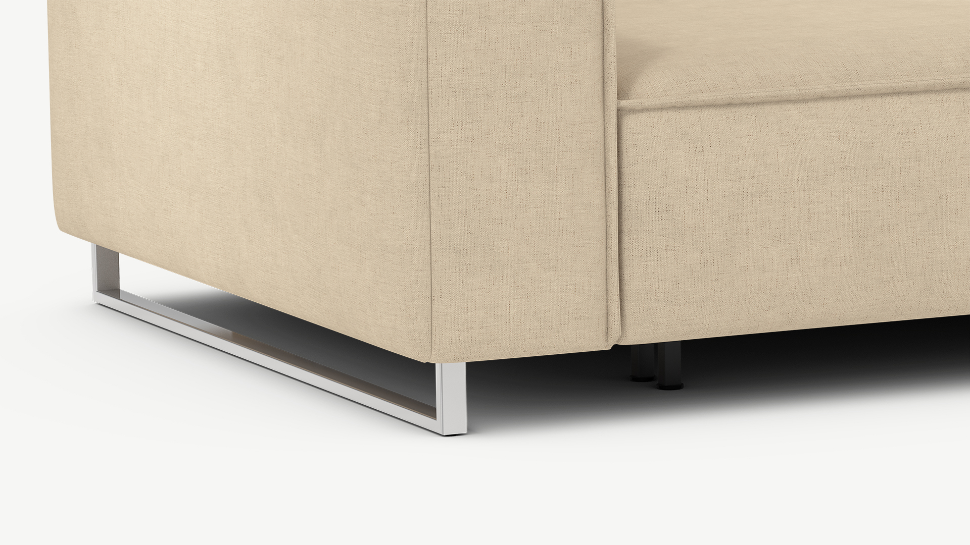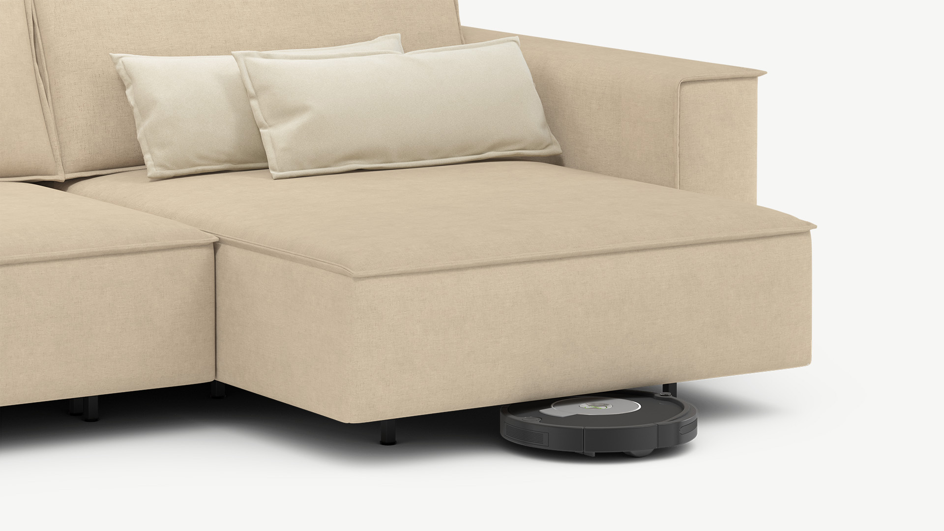 Благодаря высоким прямоугольным опорам под диваном проходит робот-пылесос и легко проводится влажная уборка, что обеспечивает чистоту и порядок в доме (при отсутствии бельевого короба под диванной секцией).