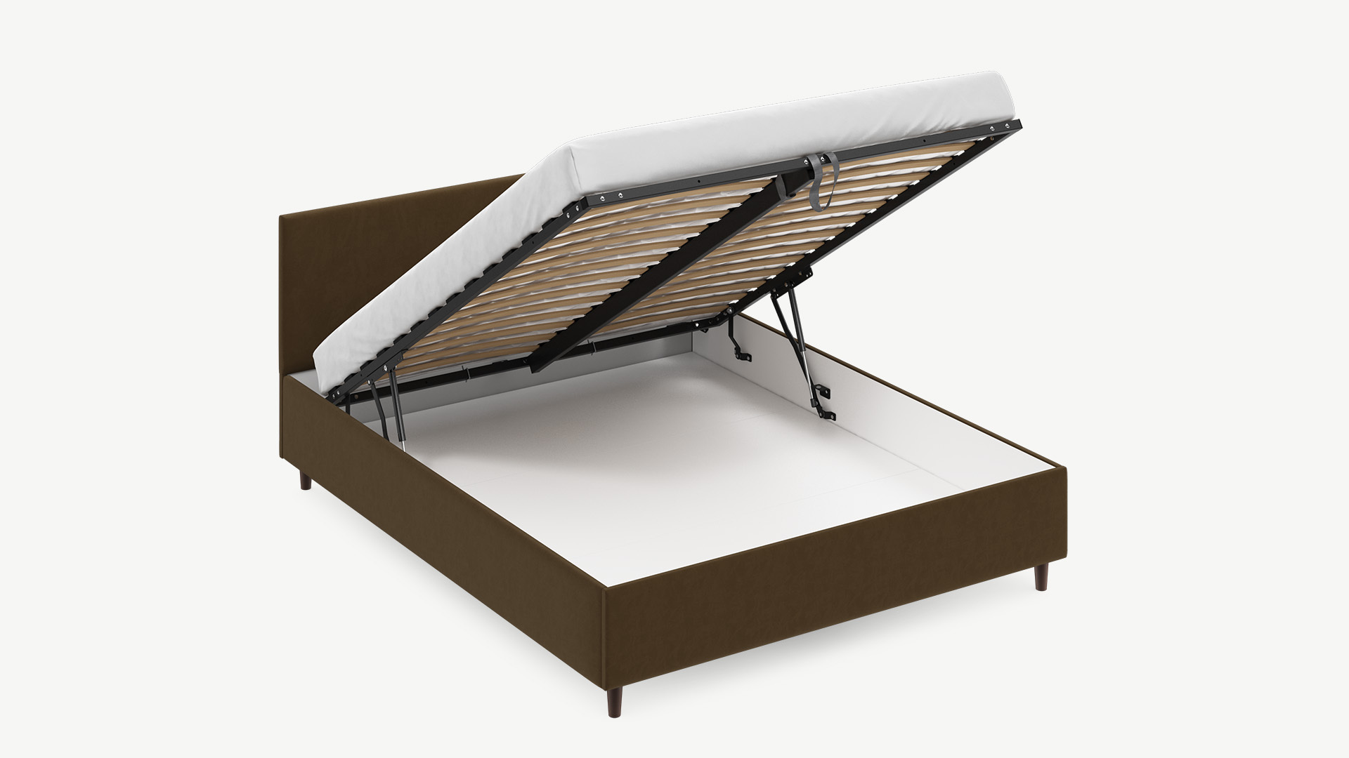 - Скрытая под основанием вместительная емкость без внутренних перегородок позволяет использовать всю площадь подкроватного пространства для хранения вещей.