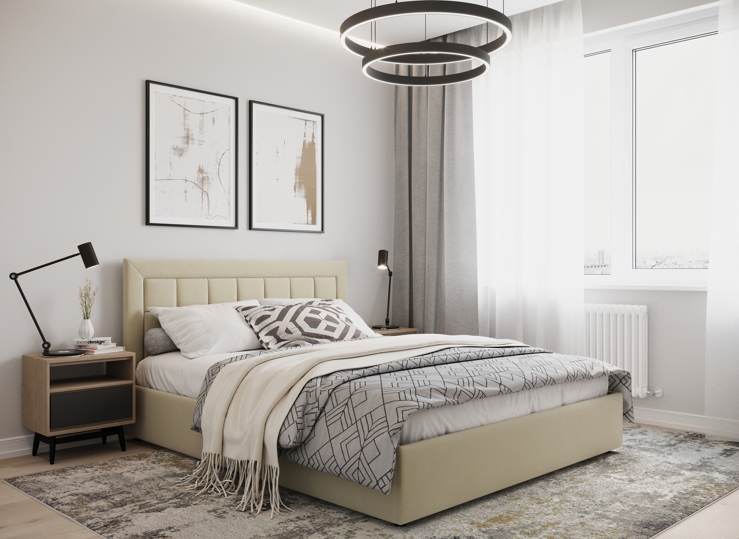 Создать гармоничный интерьер и завершить образ спальни помогут дополнительные аксессуары, например: тумбы, банкетки, подушки.
