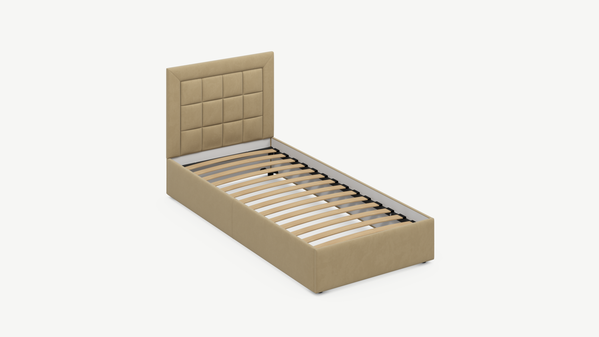 Изголовье декорировано рельефным рисунком стежки в крупный квадрат, получившим особую фактуру за счет глубины шва.