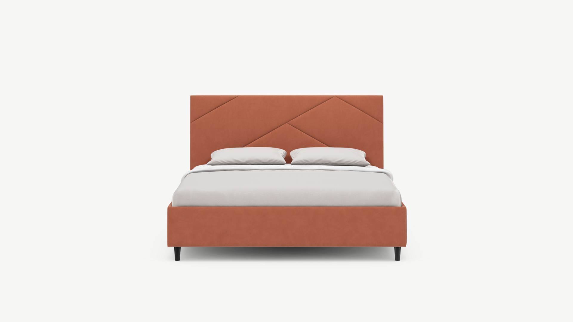 MOON FAMILY 1257 привлекает внимание оригинальным исполнением: широкие полосы ткани эффектно пересекают периметр изголовья, создавая на нем графический орнамент. Лаконичные формы объемных царг создают единый гармоничный образ и фокусируют внимание на центральном текстурном элементе кровати.