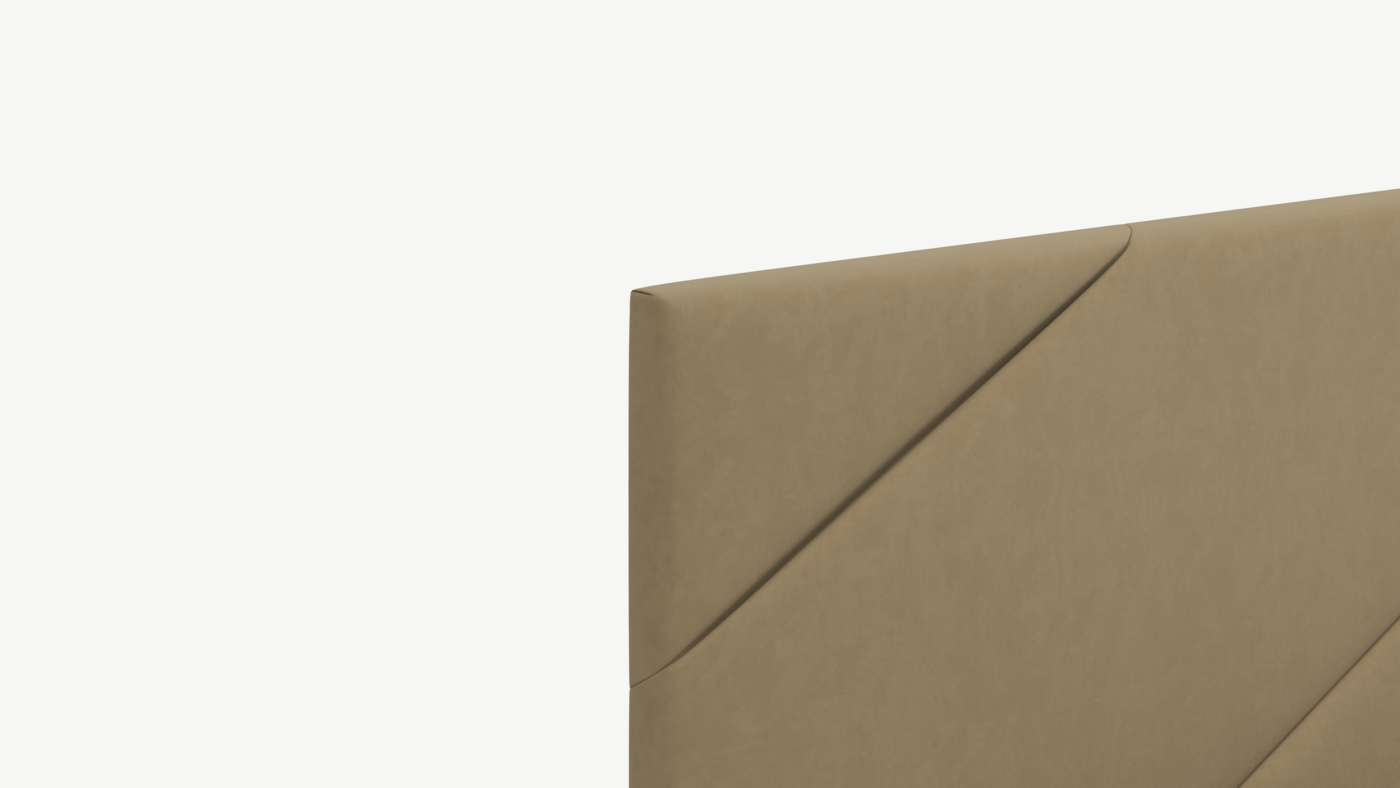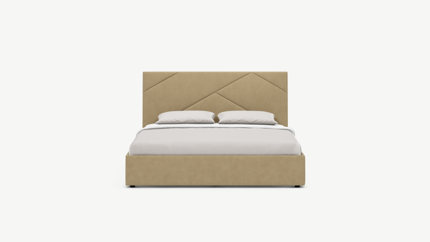 MOON FAMILY 1257 привлекает внимание оригинальным исполнением: широкие полосы ткани эффектно пересекают периметр изголовья, создавая на нем графический орнамент. Лаконичные формы объемных царг создают единый гармоничный образ и фокусируют внимание на центральном текстурном элементе кровати.