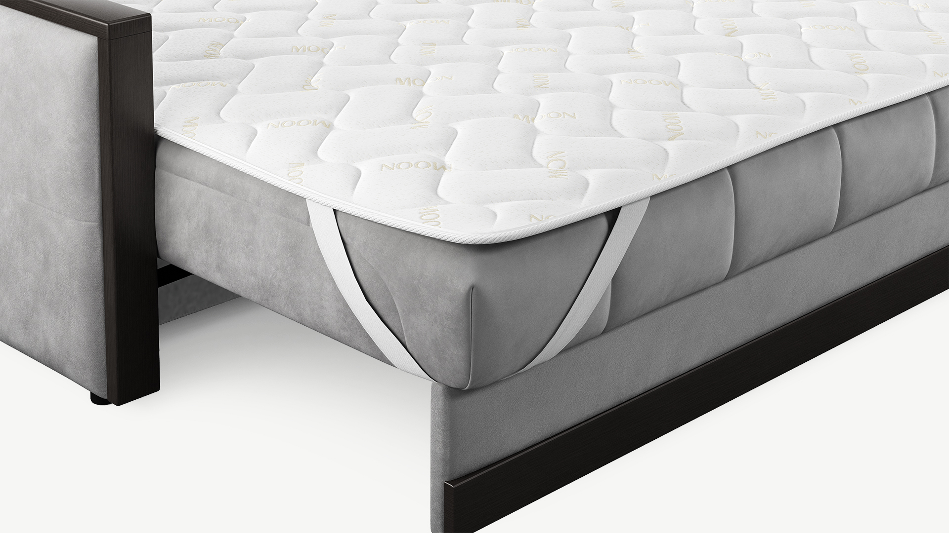 Наматрасник легко и надежно крепится к спальному месту с помощью широких резинок в четырех угловых точках.
