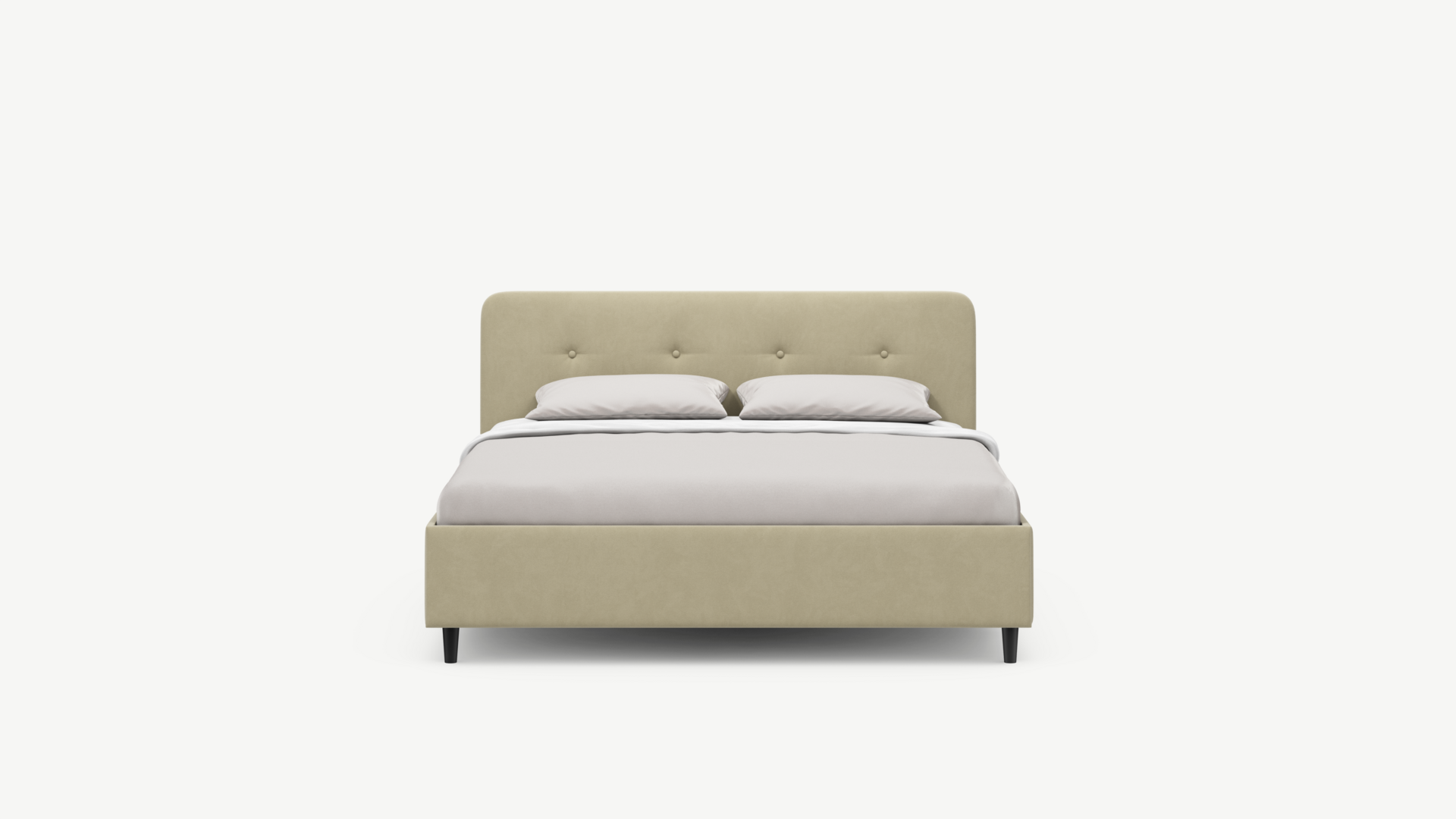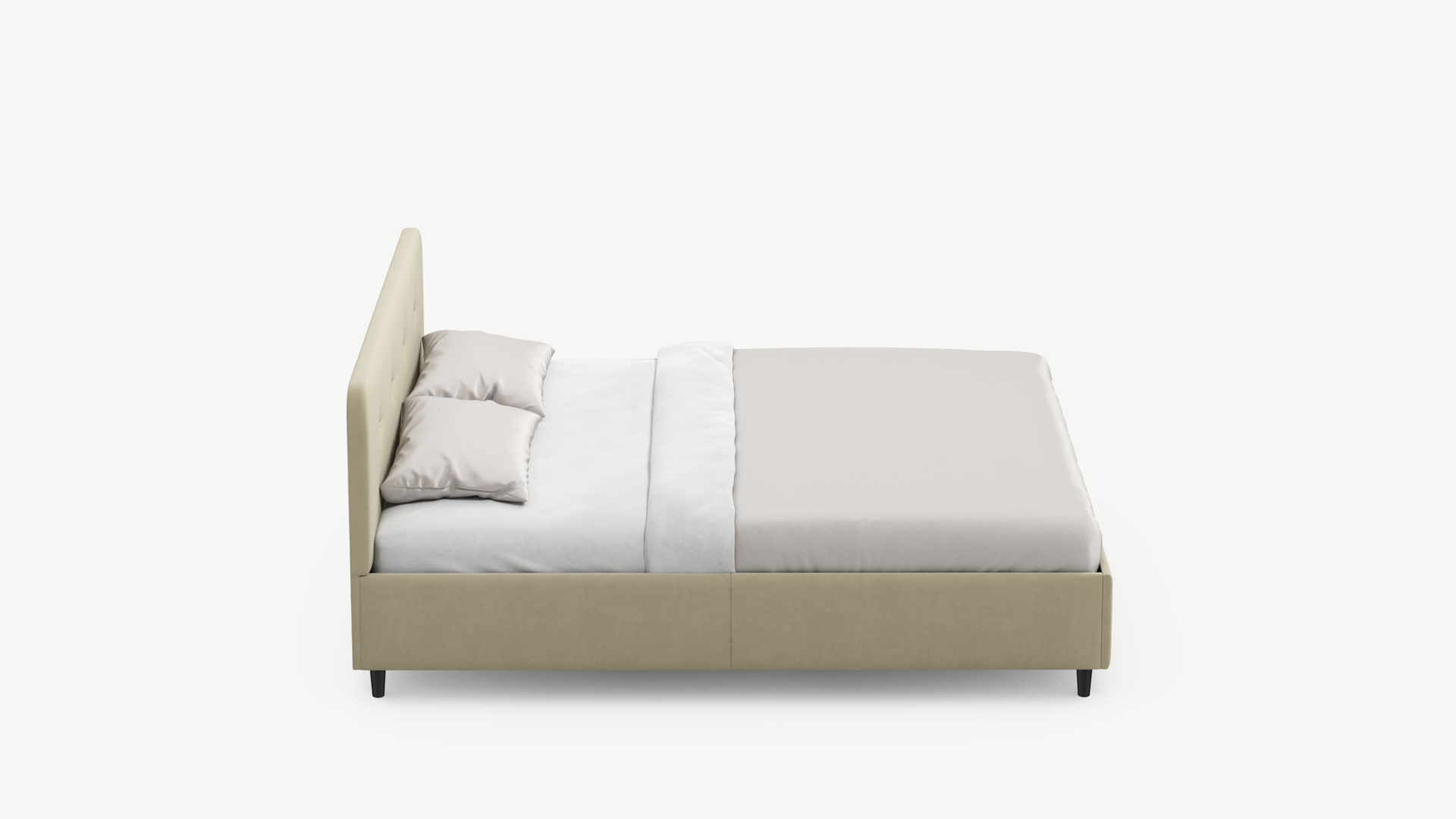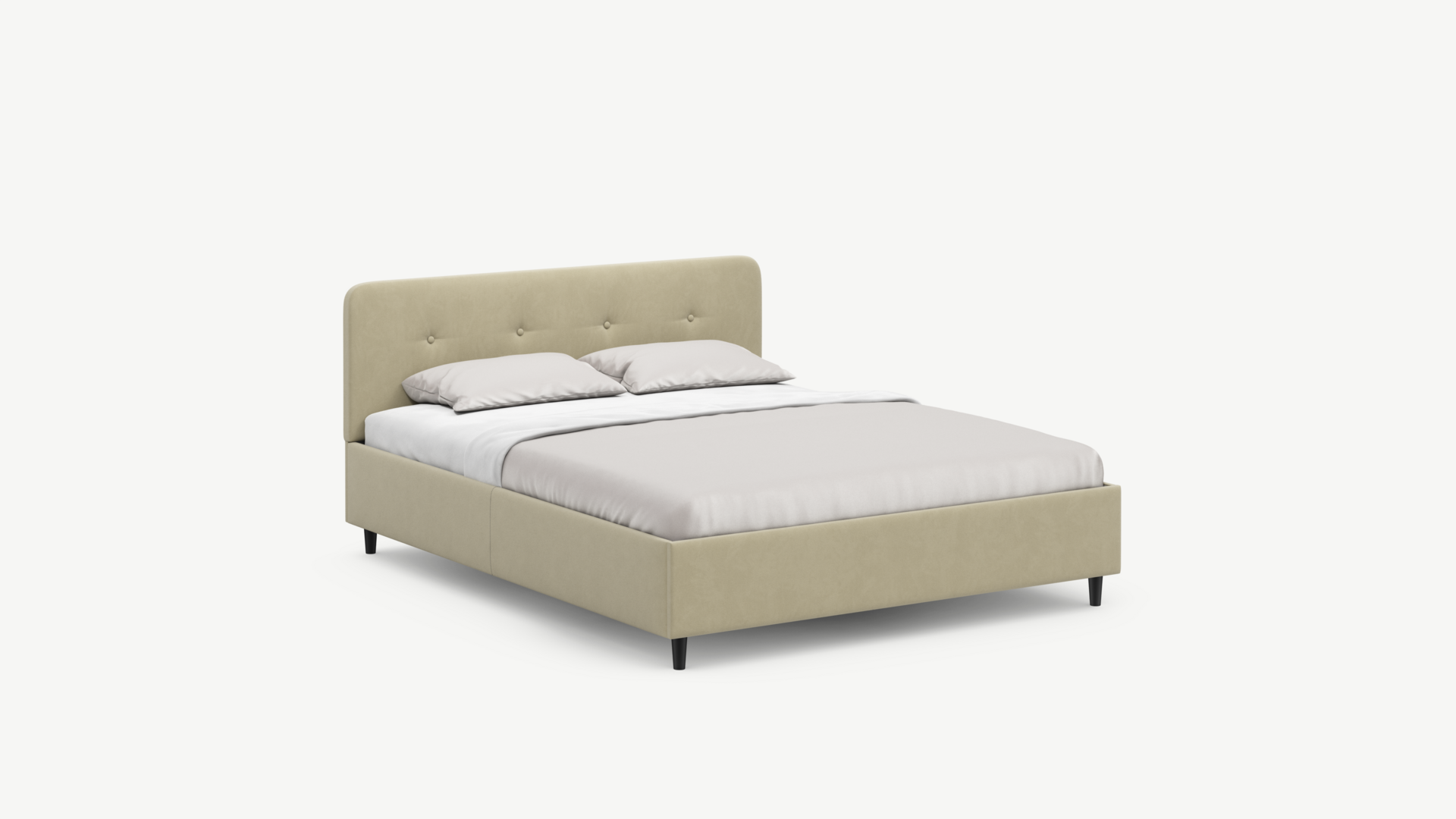Царга, задающая пропорции, благодаря гладкости своей фактуры подчеркивает центральный элемент декора. Высокие опоры приподнимают фигуру кровати над полом и добавляют её образу визуальной легкости.