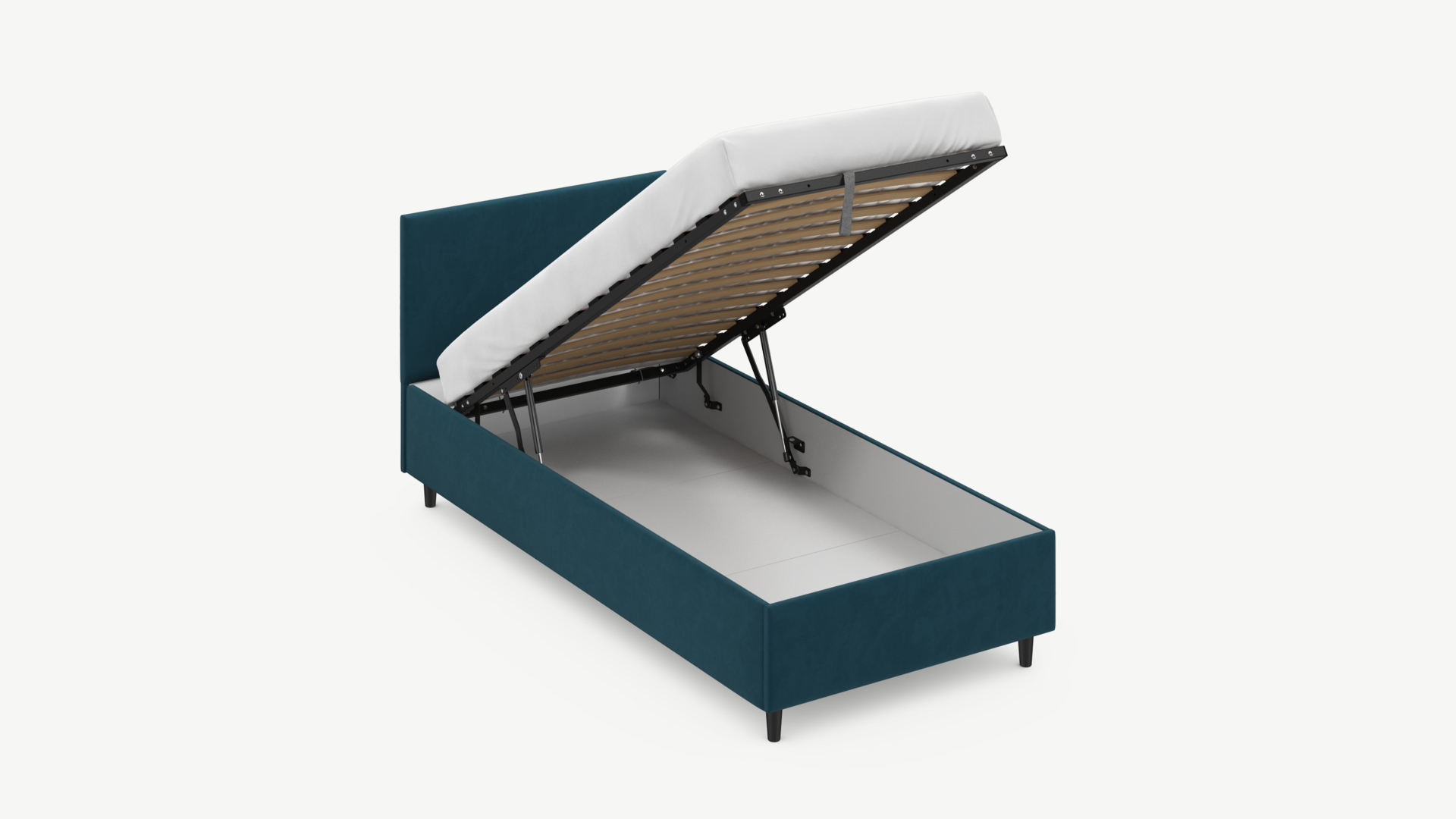 Вместительная емкость под кроватью без внутренних перегородок позволяет использовать для хранения вещей 100% пространства.