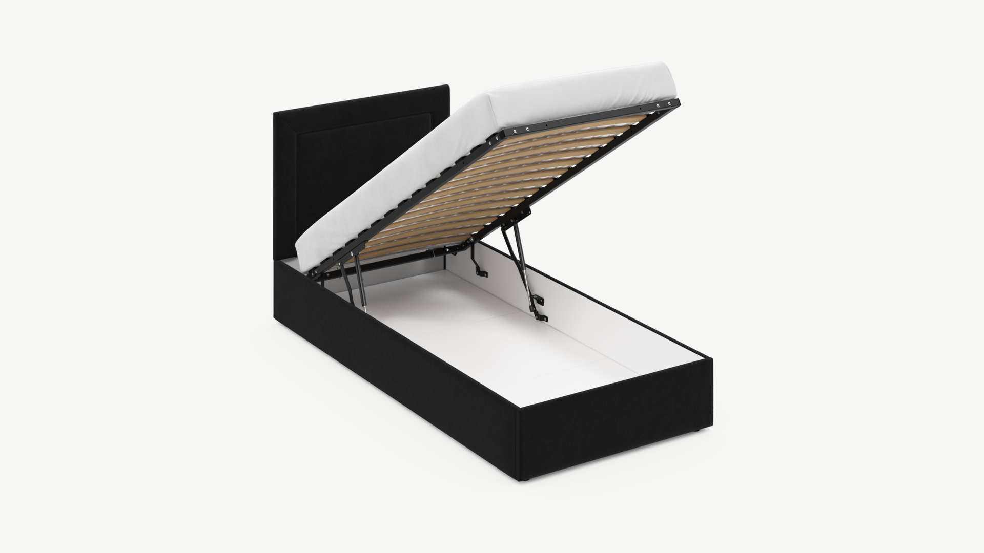 Вместительная емкость под кроватью без внутренних перегородок позволяет использовать для хранения вещей 100% пространства.