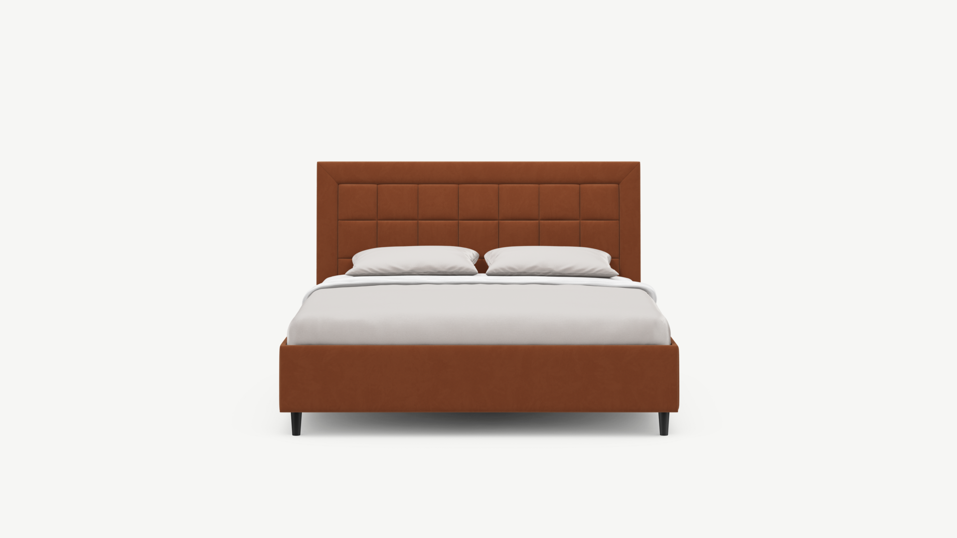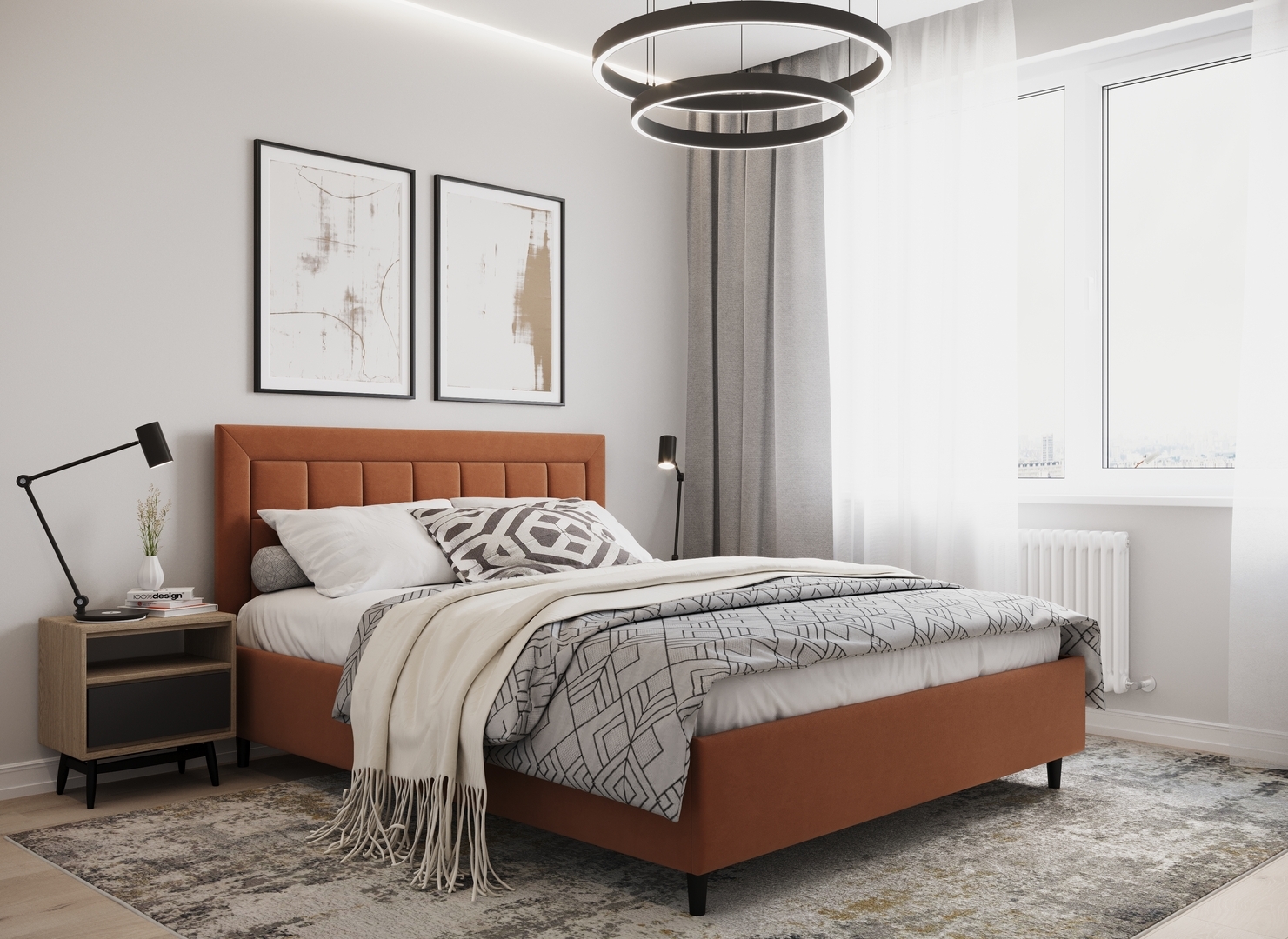 Стежка помещена в центр изголовья и обрамлена, словно картина. Объемные царги завершают цельную фигуру кровати и становятся гармоничным дополнением ее образа.
