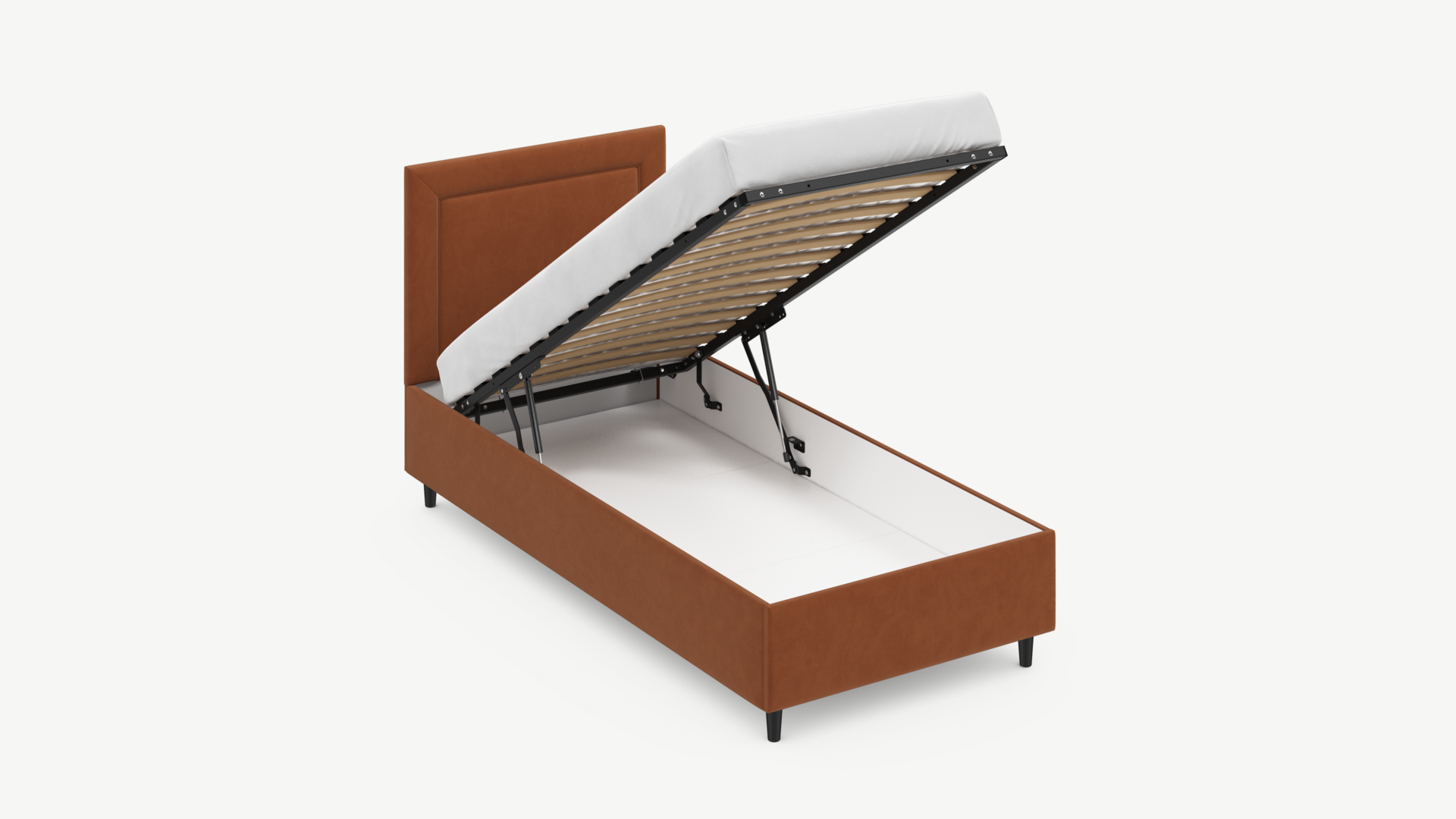 • Скрытая под основанием вместительная емкость без внутренних перегородок позволяет использовать всю площадь подкроватного пространства для хранения вещей.