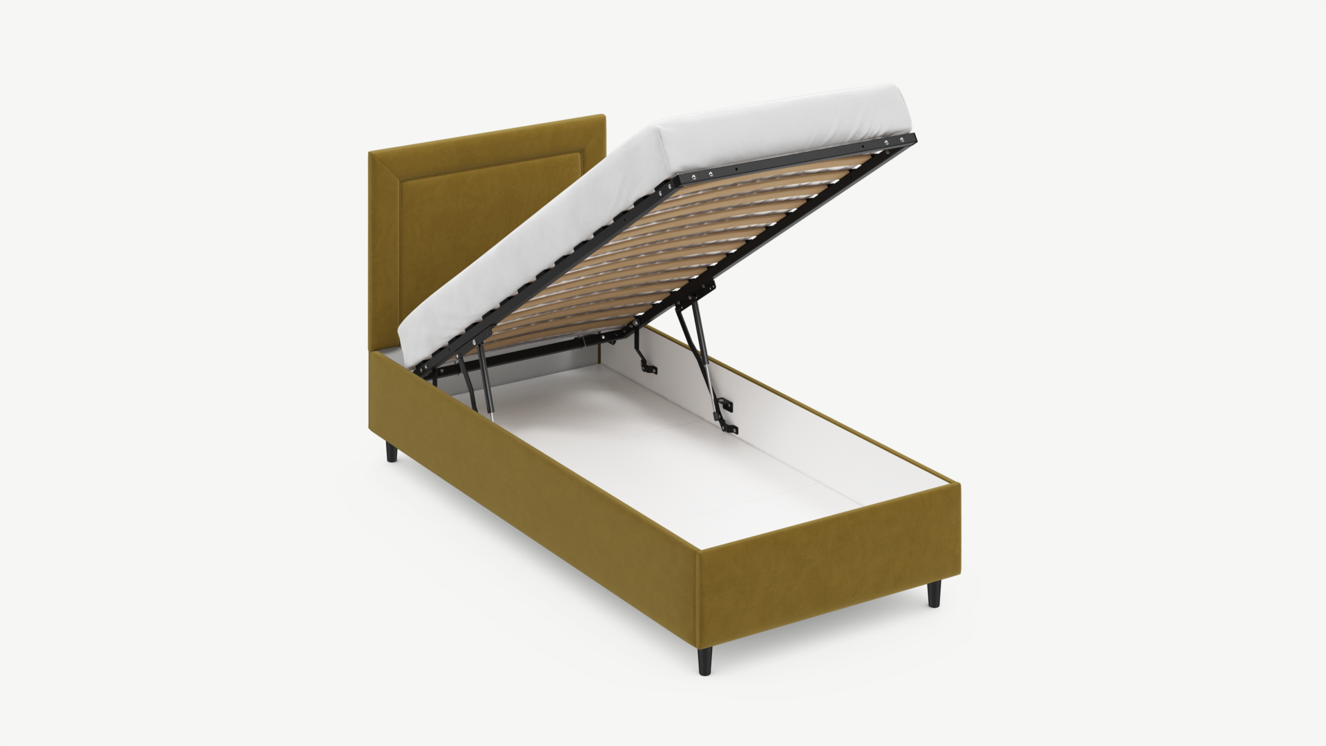 • Скрытая под основанием вместительная емкость без внутренних перегородок позволяет использовать всю площадь подкроватного пространства для хранения вещей.