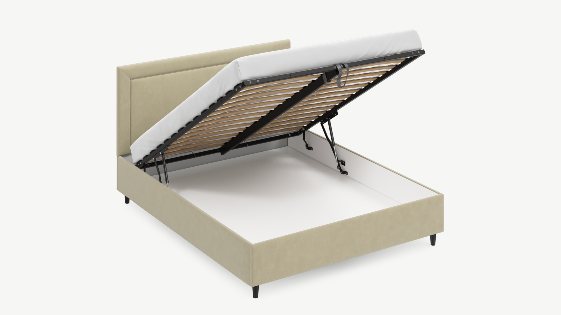Вместительная емкость под кроватью без внутренних перегородок позволяет использовать для хранения вещей 100% пространства.