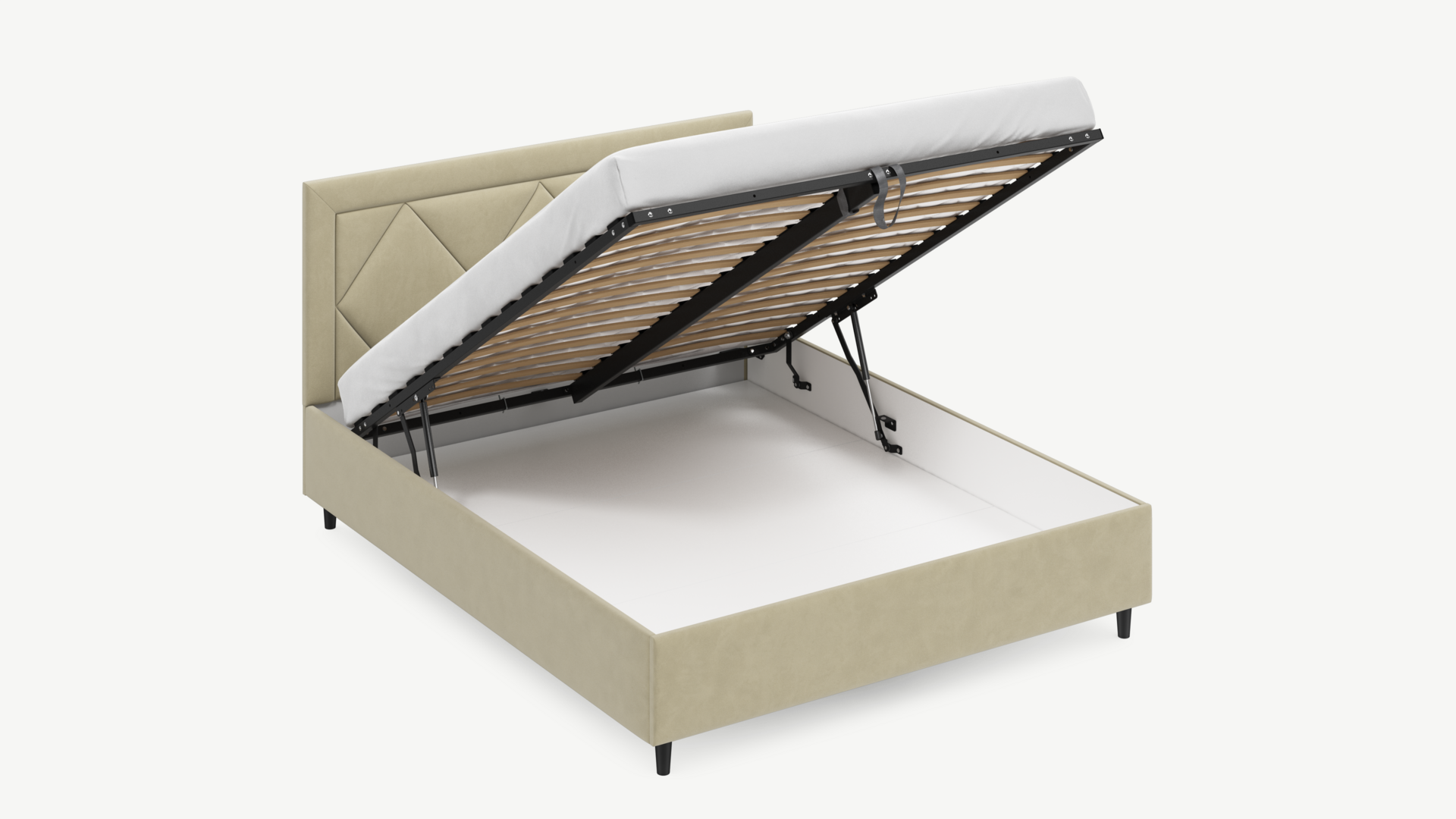 • Скрытая под основанием вместительная емкость без внутренних перегородок позволяет использовать всю площадь подкроватного пространства для хранения вещей.