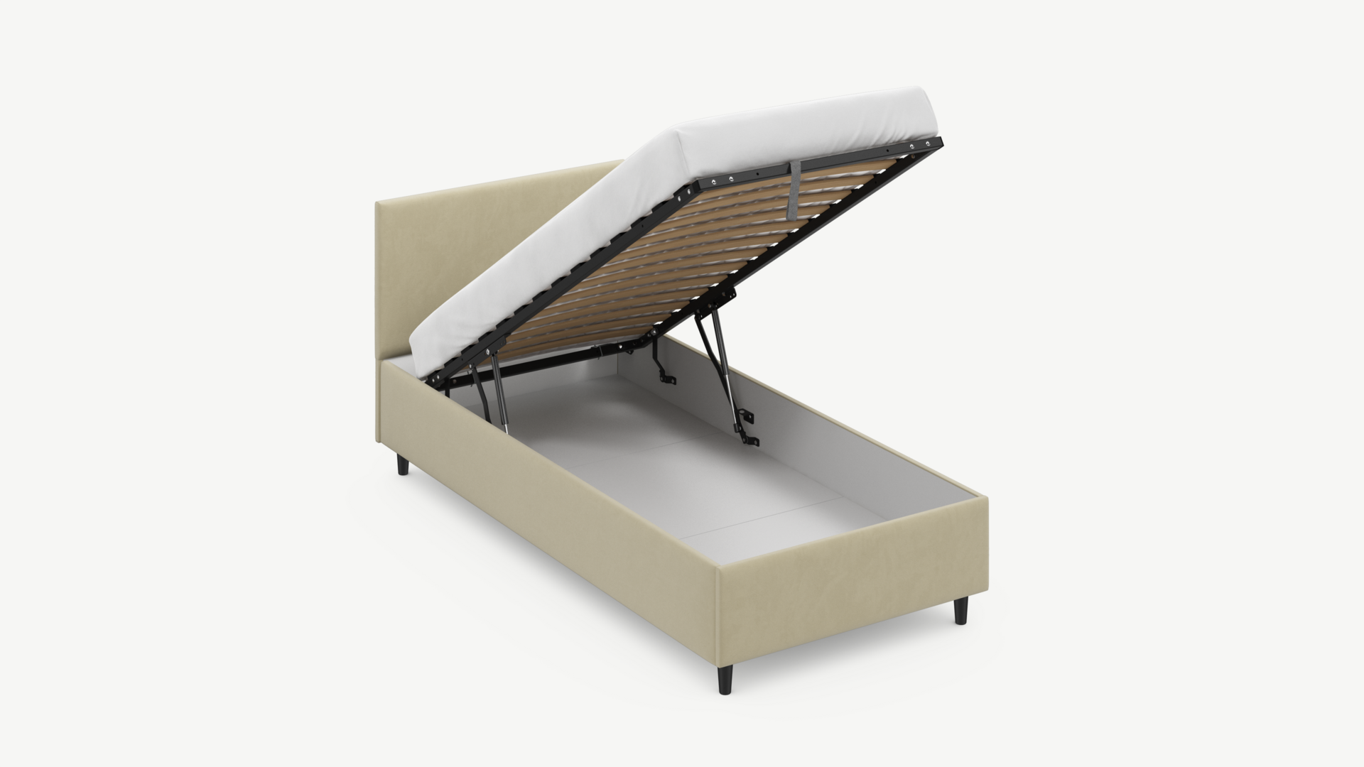 Вместительная емкость под кроватью без внутренних перегородок позволяет использовать для хранения вещей 100% пространства.