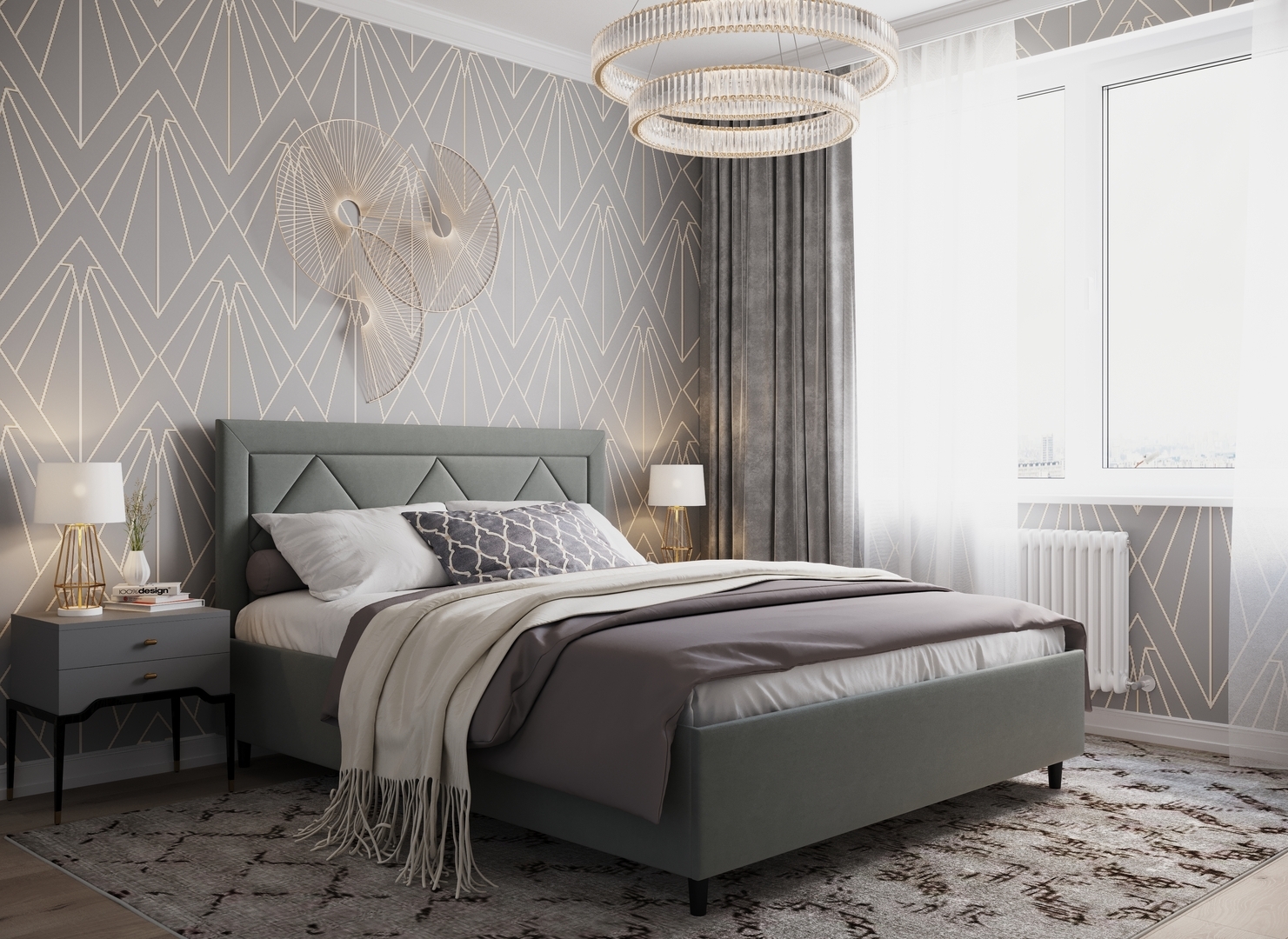 Создать гармоничный интерьер и завершить образ спальни помогут дополнительные аксессуары, например: тумбы, банкетки, подушки.