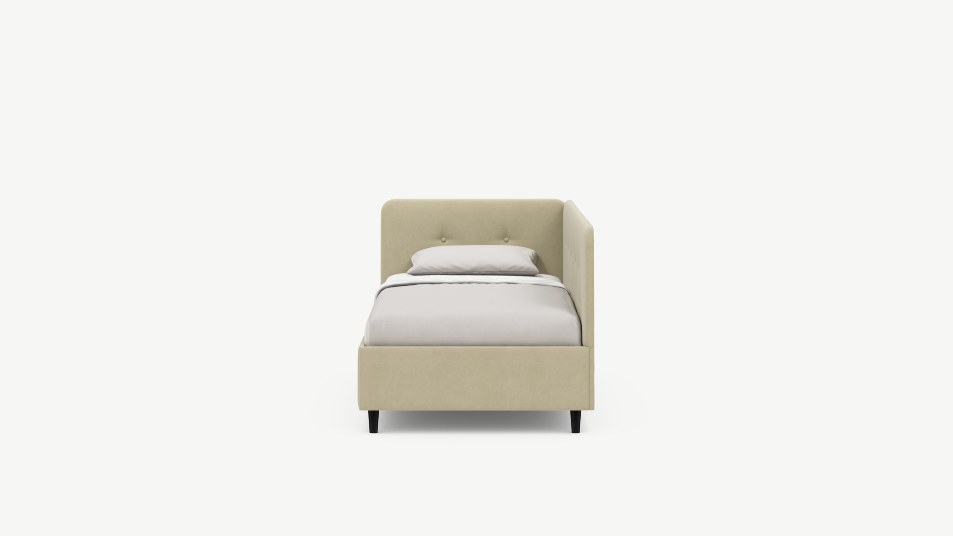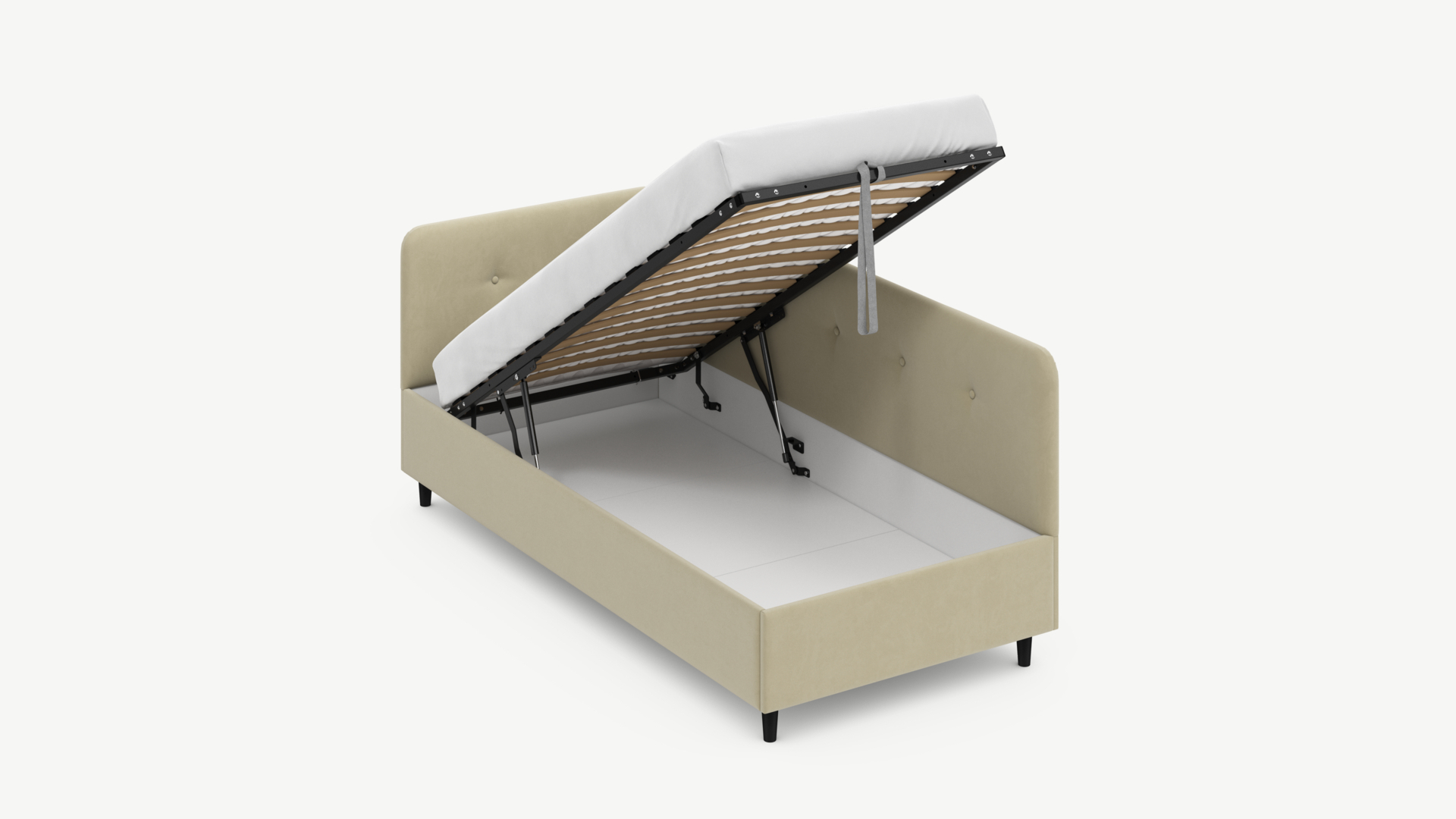 Кровать угловая с подъемным механизмомУгловая односпальная кровать MOON FAMILY 1253 с мягкой спинкой и изголовьем обладает округлыми формами, привносящими в интерьер нотки нежности. Изголовье, украшенное пуговицами, добавляет окружающему пространству шарм и уют. Высокие опоры придают кровати визуальной легкости, а также обеспечивают удобство во время уборки.