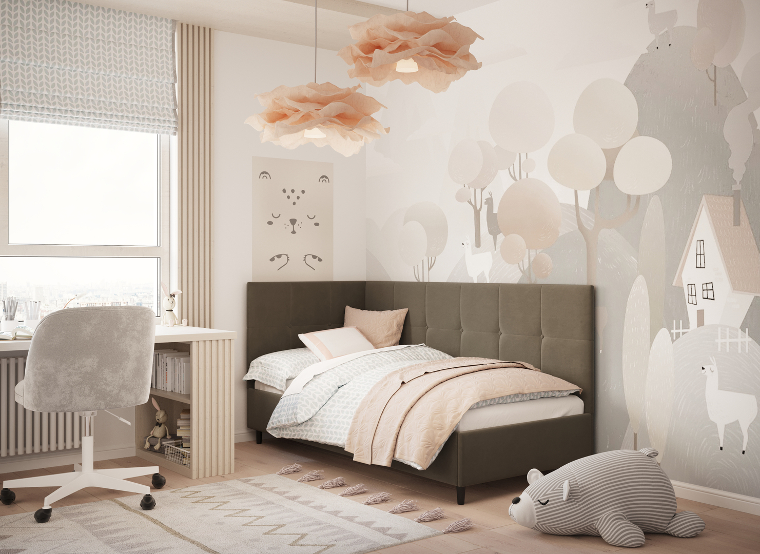 Угловая односпальная кровать MOON FAMILY 1261 с мягкой спинкой и изголовьем создаст в Вашей спальне ощущение уюта. Крупная квадратная стежка привносит в интерьер графических акцентов, а вставка из пуговиц наполняет пространство ощущением домашнего тепла.