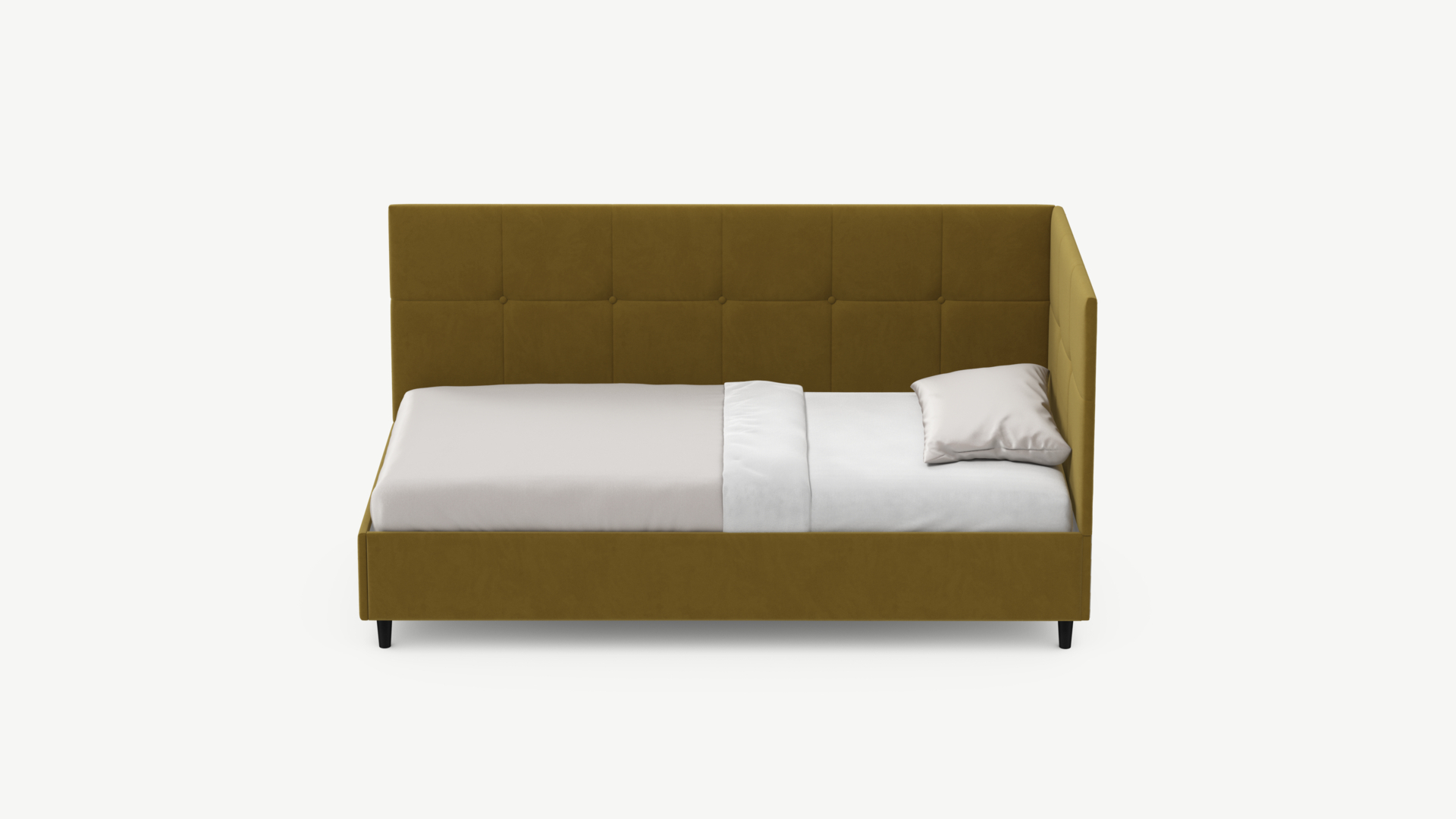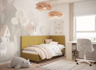 Угловая односпальная кровать MOON FAMILY 1261 с мягкой спинкой и изголовьем создаст в Вашей спальне ощущение уюта. Крупная квадратная стежка привносит в интерьер графических акцентов, а вставка из пуговиц наполняет пространство ощущением домашнего тепла.