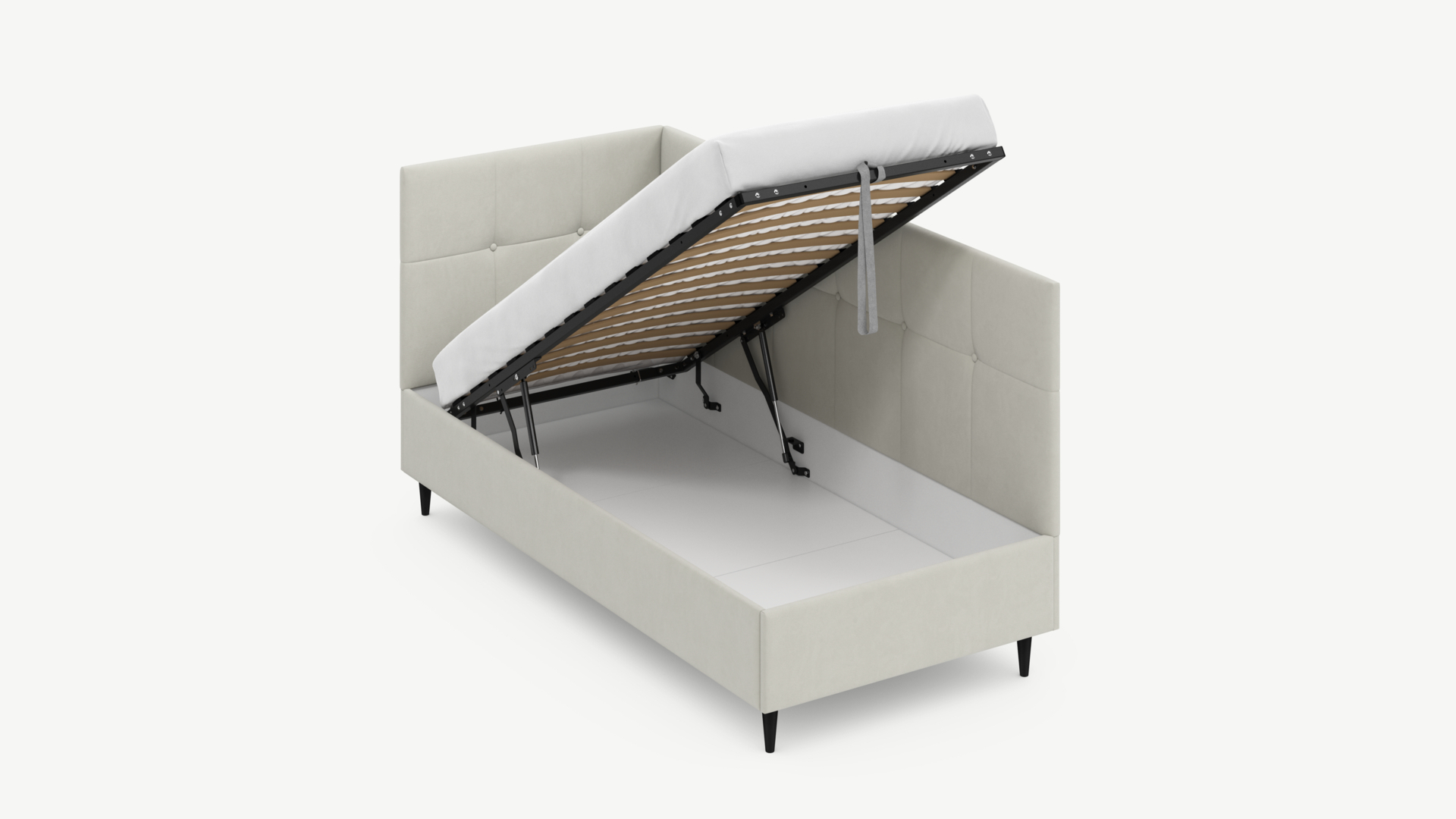 Угловая односпальная кровать MOON FAMILY 1261 с мягкой спинкой и изголовьем создаст в Вашей спальне ощущение уюта. Крупная квадратная стежка привносит в интерьер графических акцентов, а вставка из пуговиц наполняет пространство ощущением домашнего тепла.