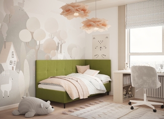 Угловая односпальная кровать MOON FAMILY 1261 с мягкой спинкой и изголовьем создаст в Вашей спальне ощущение уюта. Крупная квадратная стежка привносит в интерьер графических акцентов, а вставка из пуговиц наполняет пространство ощущением домашнего тепла.