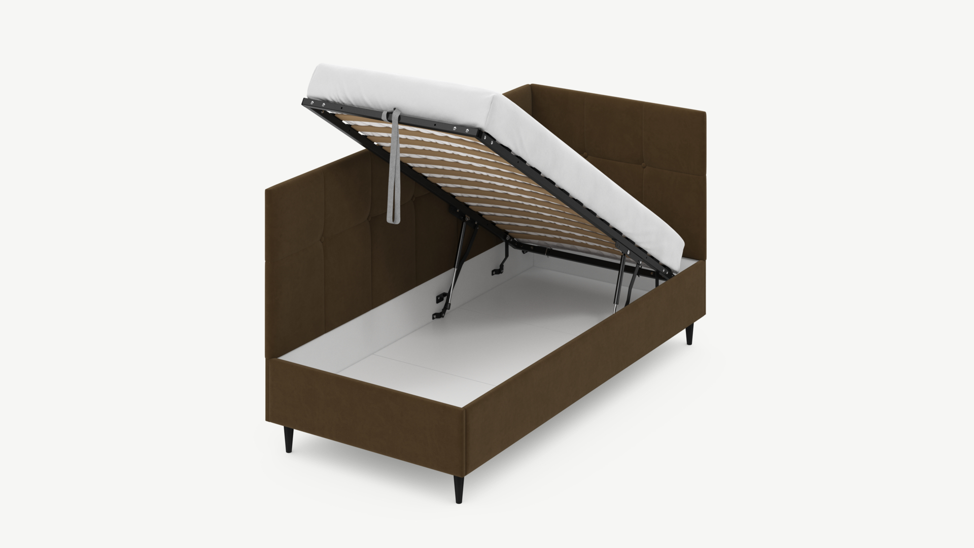 • Скрытая под основанием вместительная емкость без внутренних перегородок позволяет использовать всю площадь подкроватного пространства для хранения вещей.