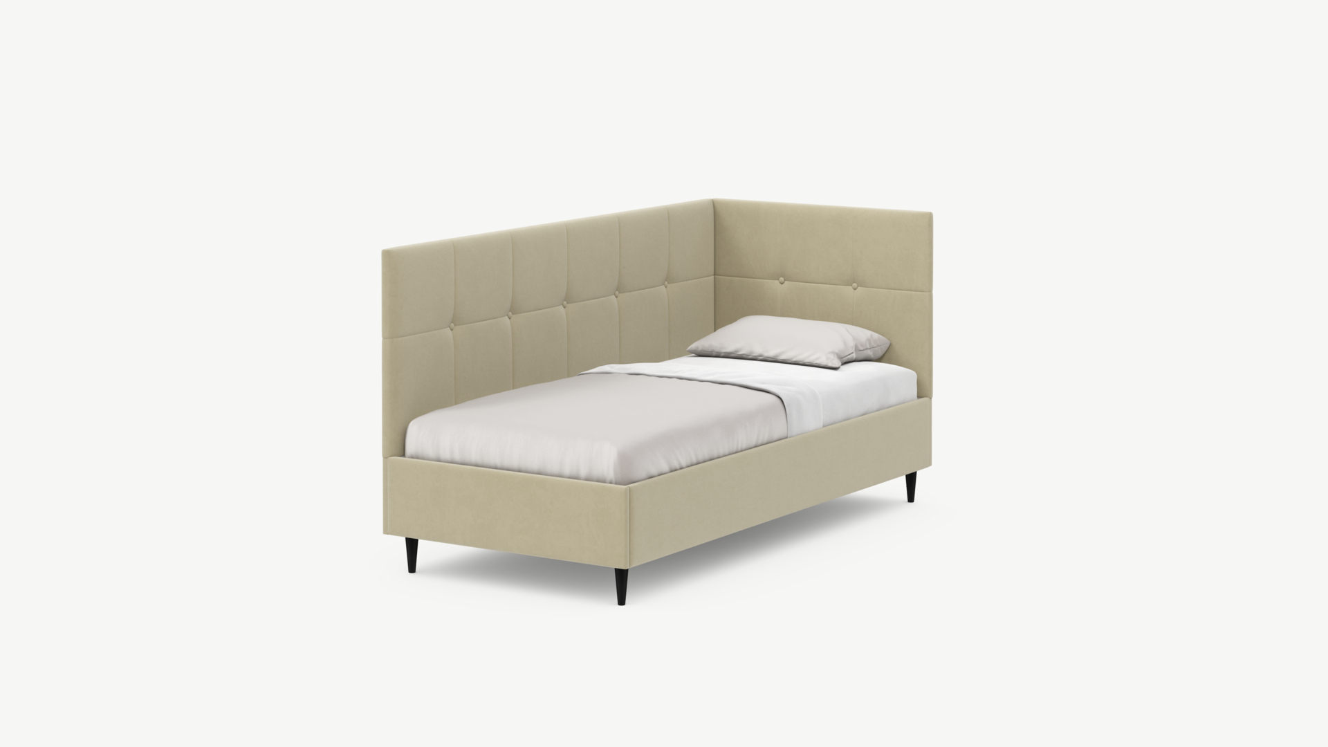Угловая односпальная кровать MOON FAMILY 1261 с мягкой спинкой и изголовьем создаст в Вашей спальне ощущение уюта. Крупная квадратная стежка привносит в интерьер графических акцентов, а вставка из пуговиц наполняет пространство ощущением домашнего тепла.