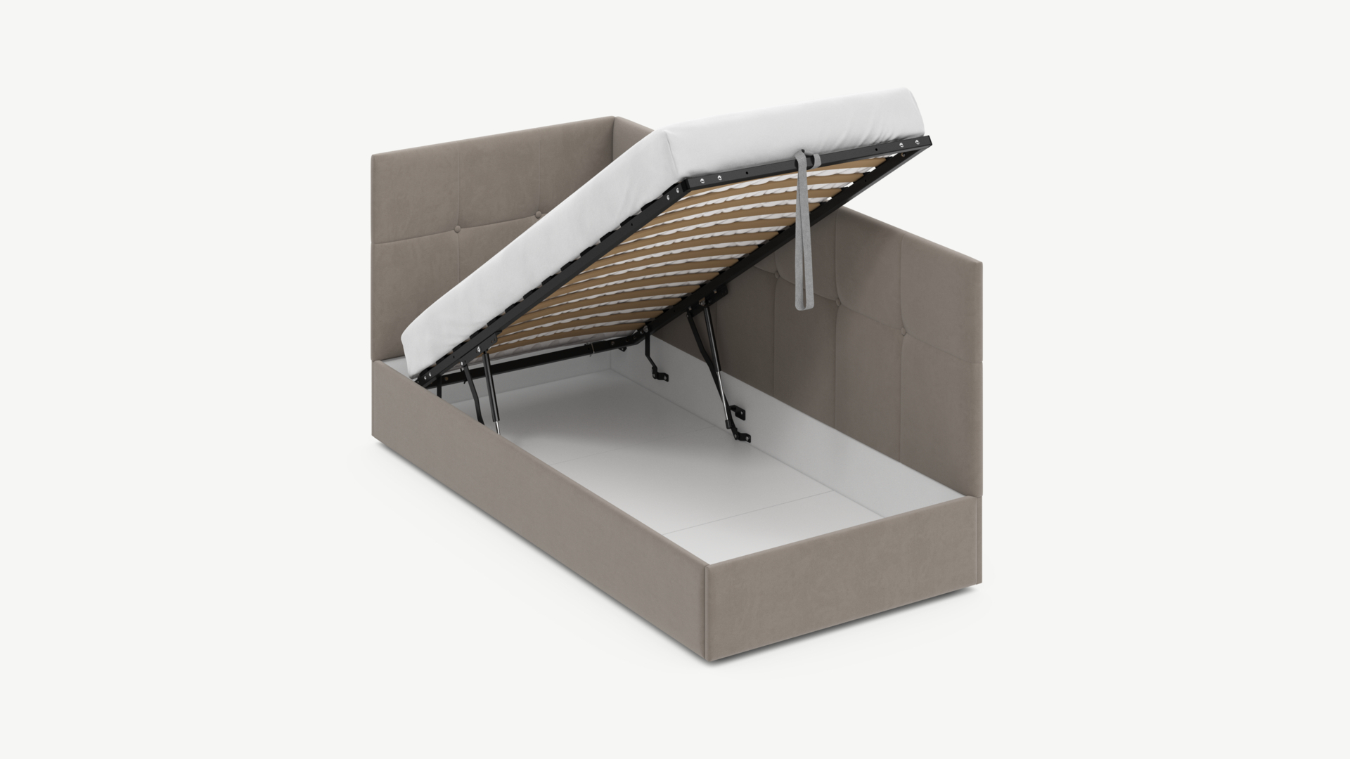 • Регулируемый подъемный механизм имеет два положения установки газовых амортизаторов в зависимости от веса матраса. Это дает возможность оптимально подстраивать угол подъема основания, а также плавно и бесшумно поднимать и опускать спальное место.