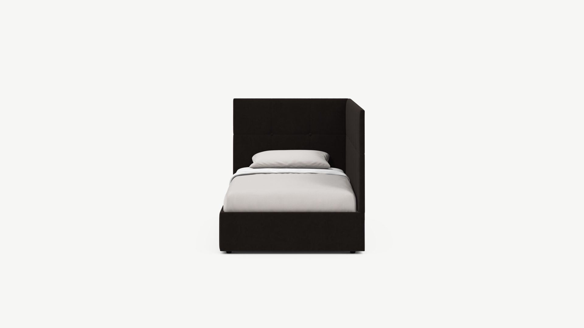 Угловая односпальная кровать MOON FAMILY 1261 с мягкой спинкой и изголовьем создаст в Вашей спальне ощущение уюта. Крупная квадратная стежка привносит в интерьер графических акцентов, а вставка из пуговиц наполняет пространство ощущением домашнего тепла.