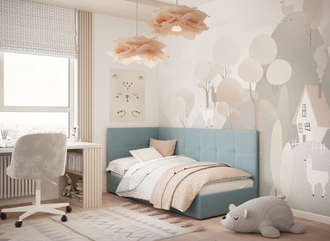 Угловая односпальная кровать MOON FAMILY 1261 с мягкой спинкой и изголовьем создаст в Вашей спальне ощущение уюта. Крупная квадратная стежка привносит в интерьер графических акцентов, а вставка из пуговиц наполняет пространство ощущением домашнего тепла.