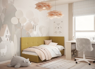 Угловая односпальная кровать MOON FAMILY 1261 с мягкой спинкой и изголовьем создаст в Вашей спальне ощущение уюта. Крупная квадратная стежка привносит в интерьер графических акцентов, а вставка из пуговиц наполняет пространство ощущением домашнего тепла.