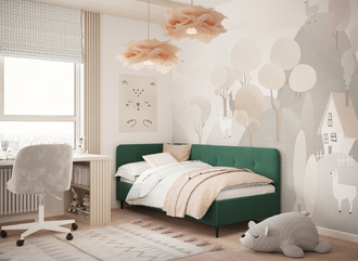 Угловая односпальная кровать MOON FAMILY 1253 с мягкой спинкой и изголовьем обладает округлыми формами, привносящими в интерьер нотки нежности. Изголовье, украшенное пуговицами, добавляет окружающему пространству шарм и уют. Высокие опоры придают кровати визуальной легкости, а также обеспечивают удобство во время уборки.