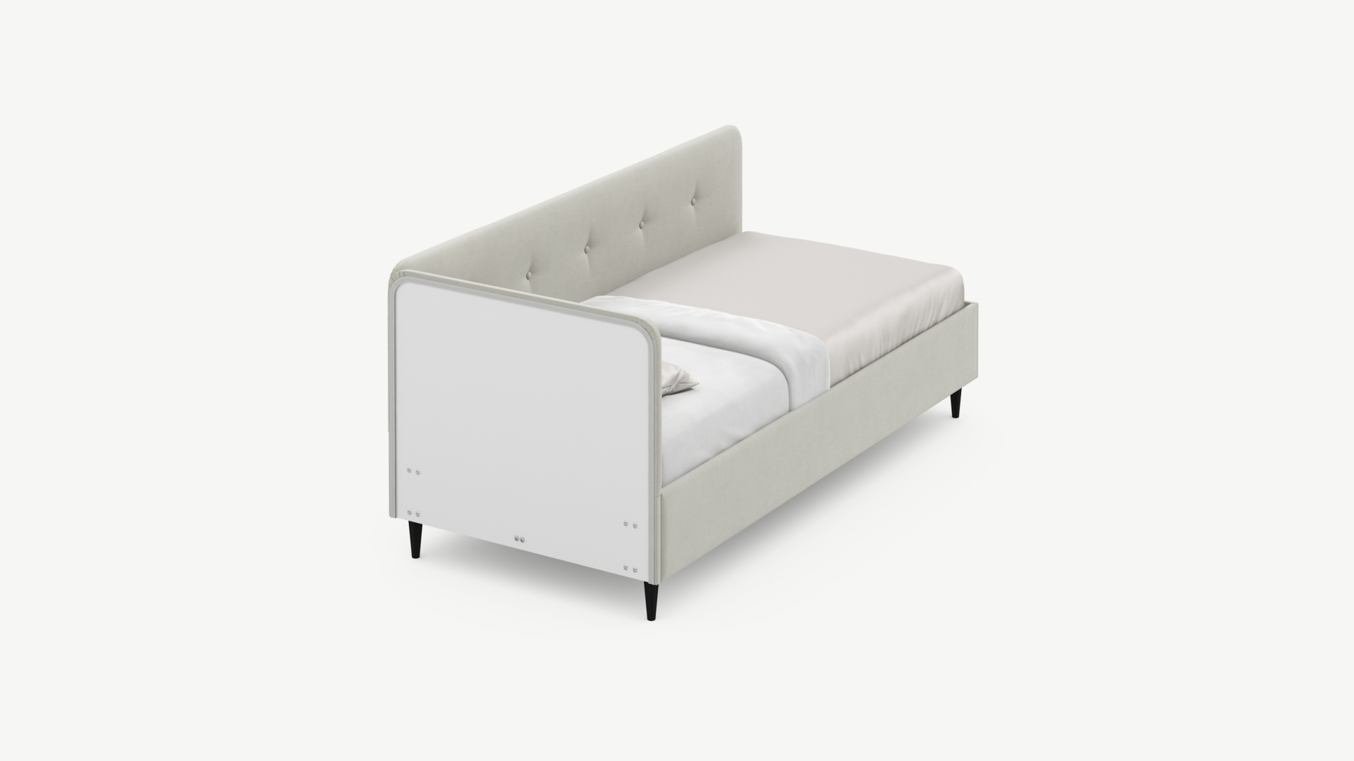 Угловая односпальная кровать MOON FAMILY 1253 с мягкой спинкой и изголовьем обладает округлыми формами, привносящими в интерьер нотки нежности. Изголовье, украшенное пуговицами, добавляет окружающему пространству шарм и уют. Высокие опоры придают кровати визуальной легкости, а также обеспечивают удобство во время уборки.