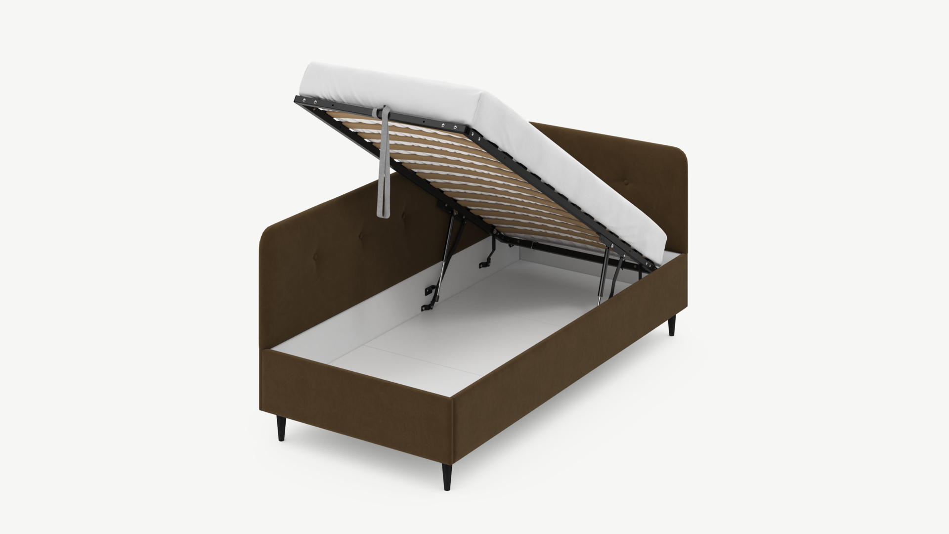 • Скрытая под основанием вместительная емкость без внутренних перегородок позволяет использовать всю площадь подкроватного пространства для хранения вещей.