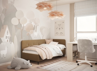 Угловая односпальная кровать MOON FAMILY 1253 с мягкой спинкой и изголовьем обладает округлыми формами, привносящими в интерьер нотки нежности. Изголовье, украшенное пуговицами, добавляет окружающему пространству шарм и уют. Высокие опоры придают кровати визуальной легкости, а также обеспечивают удобство во время уборки.