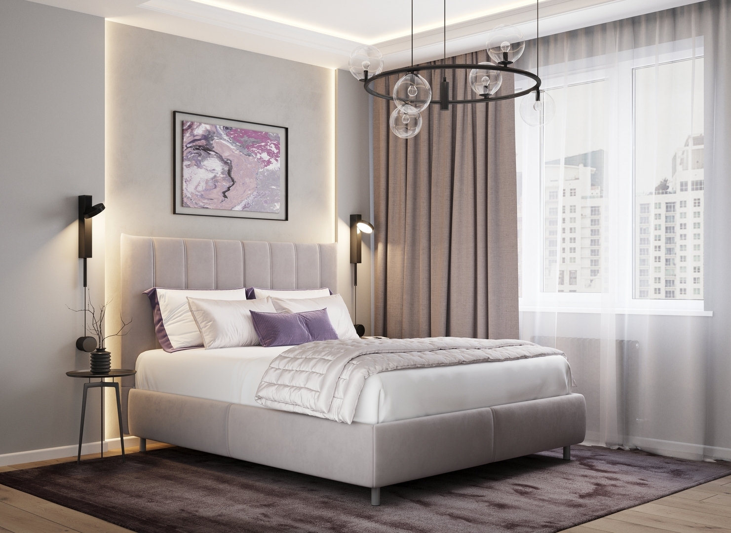 Творчески завершить образ спальни помогут дополнительные аксессуары: декоративные подушки и тумбы.