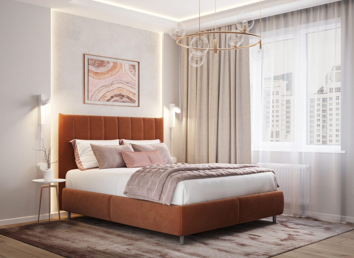 Творчески завершить образ спальни помогут дополнительные аксессуары: декоративные подушки и тумбы.