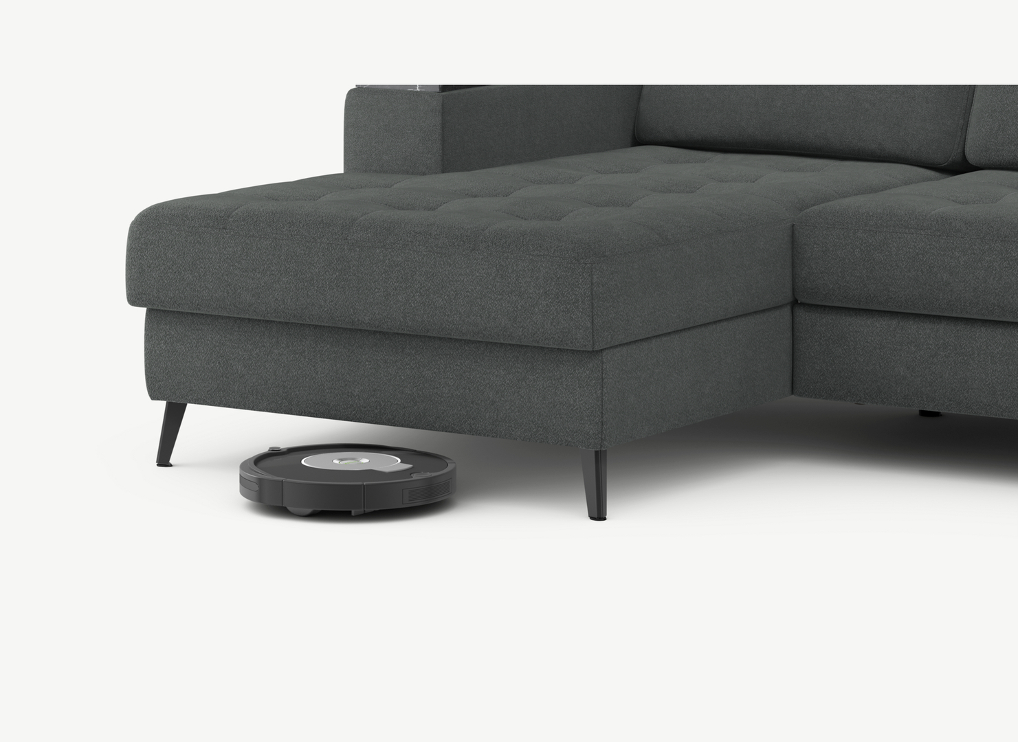 Благодаря высоким наклонным опорам под диваном проходит робот-пылесос и легко проводится влажная уборка, что обеспечивает чистоту и порядок в доме.