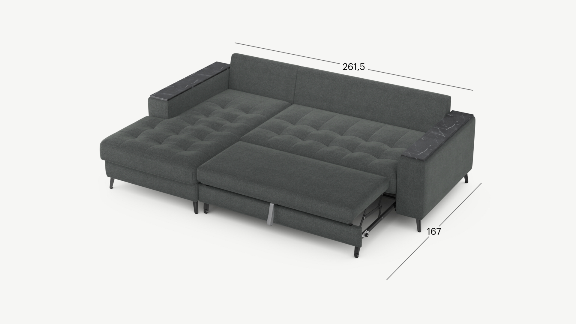 Выкатная секция выполнена в обивочной ткани, поэтому даже в разобранном виде диван выглядит презентабельно.