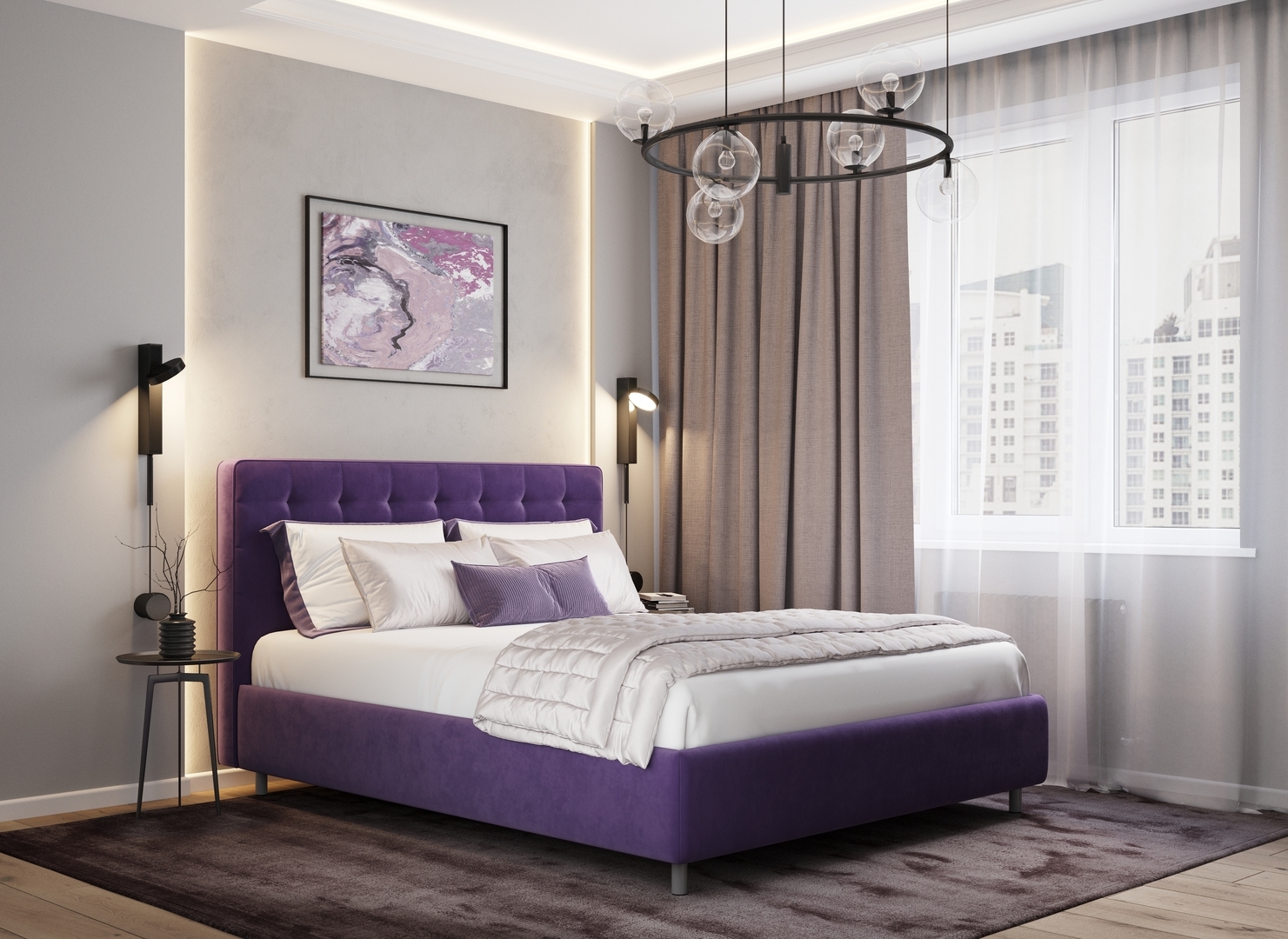 Оформите образ кровати, выбирая обивочный материал, который подчеркнет звучание Вашей спальни и отразит Ваш вкус. Обратите внимание на однотонный гладкий велюр, который усиливает объемную фактуру стежки.