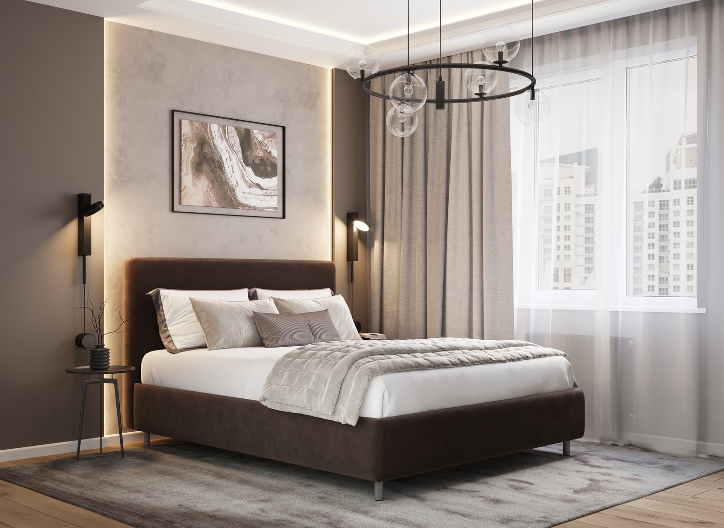 Творческий подход к выбору обивочного материала меняет образ дизайна. Велюр за счет своей бархатистой фактуры привносит в пространство шика и утонченности. Шенилл дополняет оформление спальни природными текстурами, создавая атмосферу тепла и уюта.