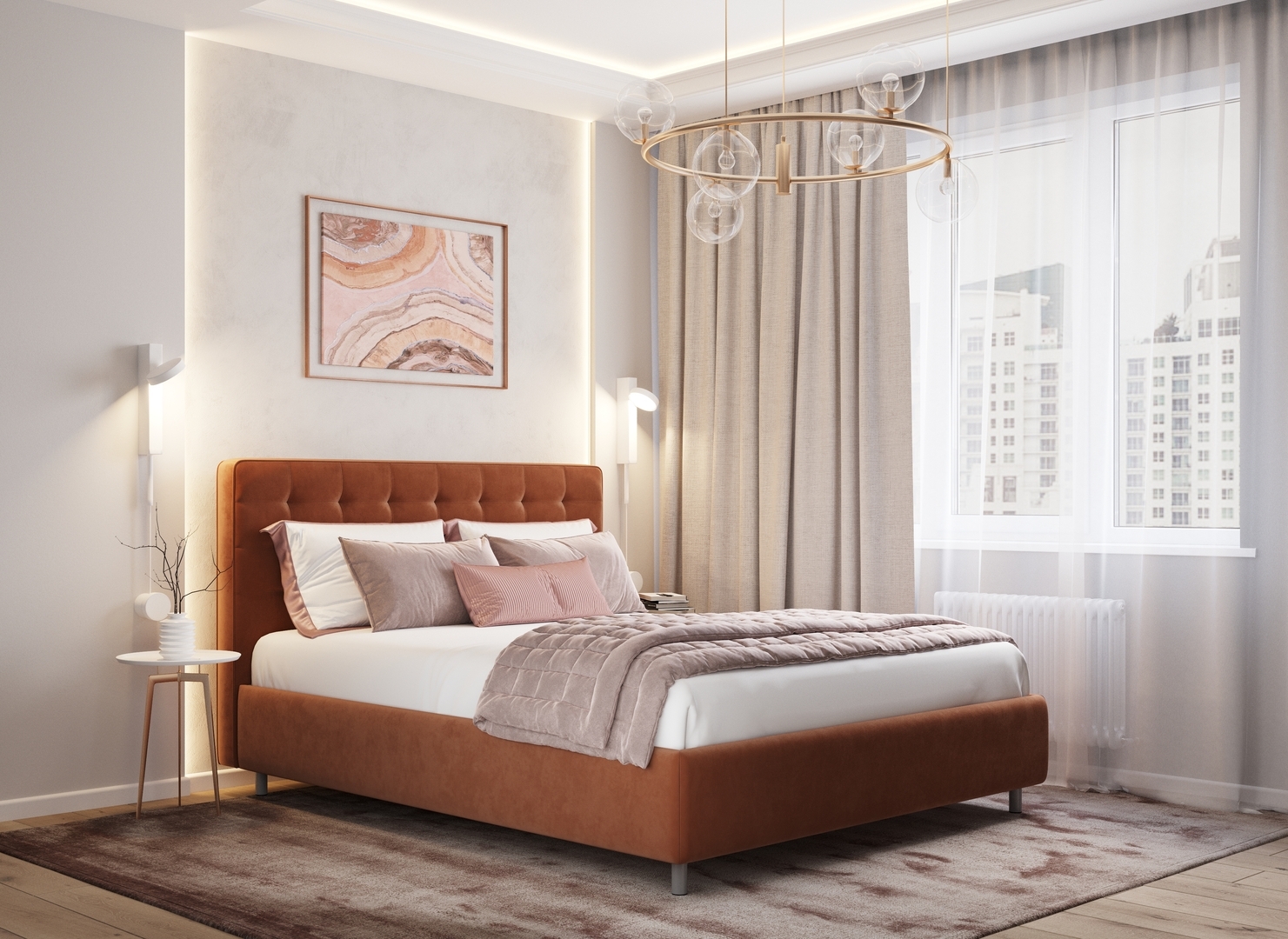 Оформите образ кровати, выбирая обивочный материал, который подчеркнет звучание Вашей спальни и отразит Ваш вкус. Обратите внимание на однотонный гладкий велюр, который усиливает объемную фактуру стежки.